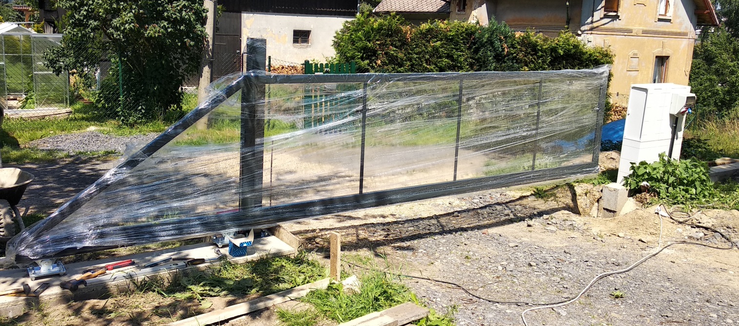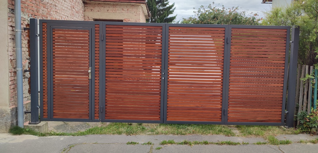 Kompletní realizace vstupní části rodinného domu — fasáda, zídka, zakázková posuvná brána s dřevěnou výplní a ocelová stříška nad vstupem.