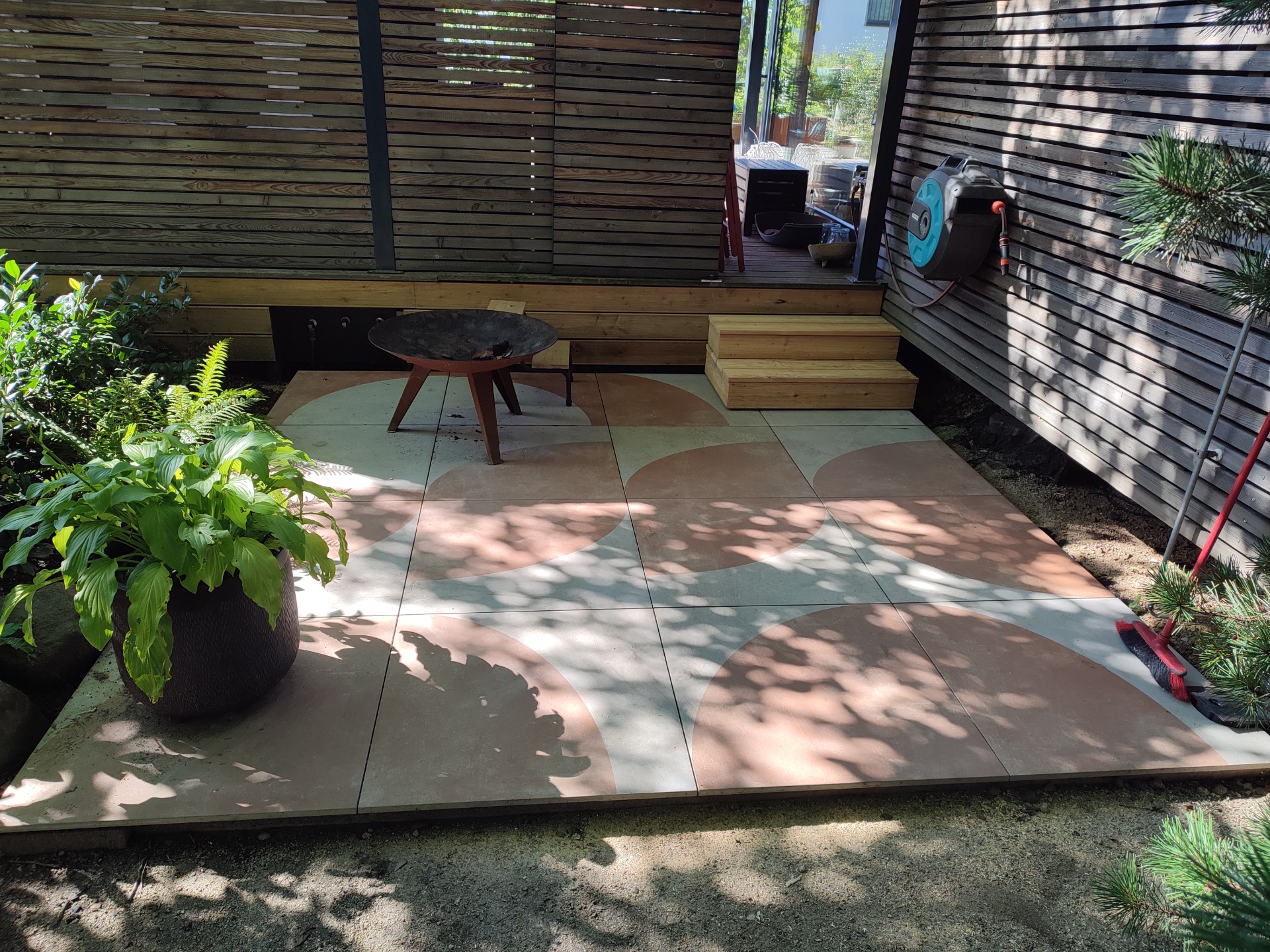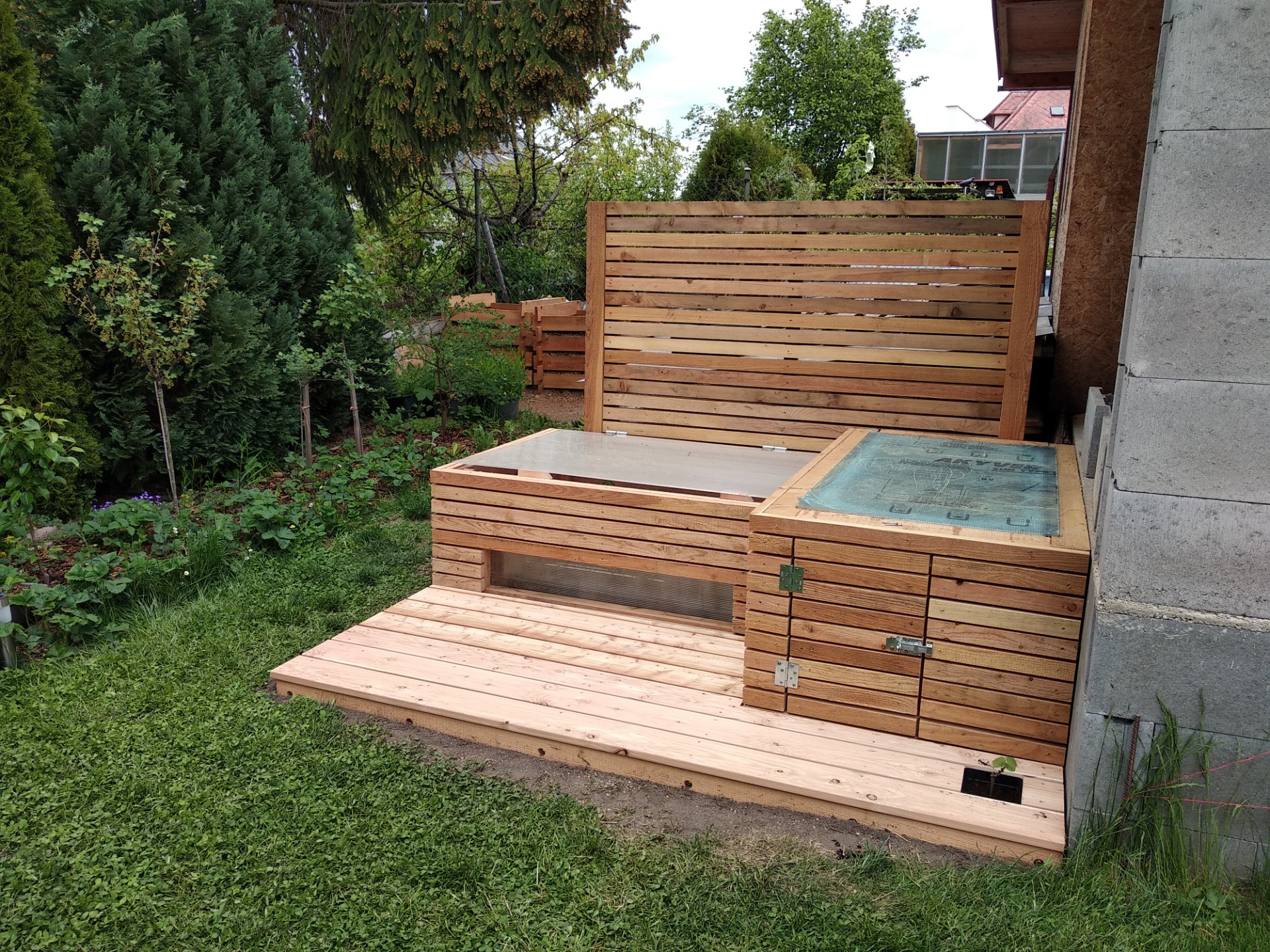 - Terasa, zástěna, pařníček i zakrytí nádrže na dešťovou vodu s úložným prostorem vyrobené jako jeden funkční celek na míru.