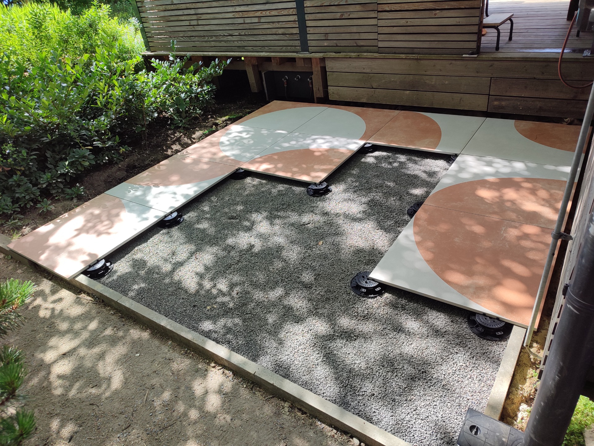Velkoformátová dlažba uložená na rektifikačních terčích včetně přípravy podkladu.
