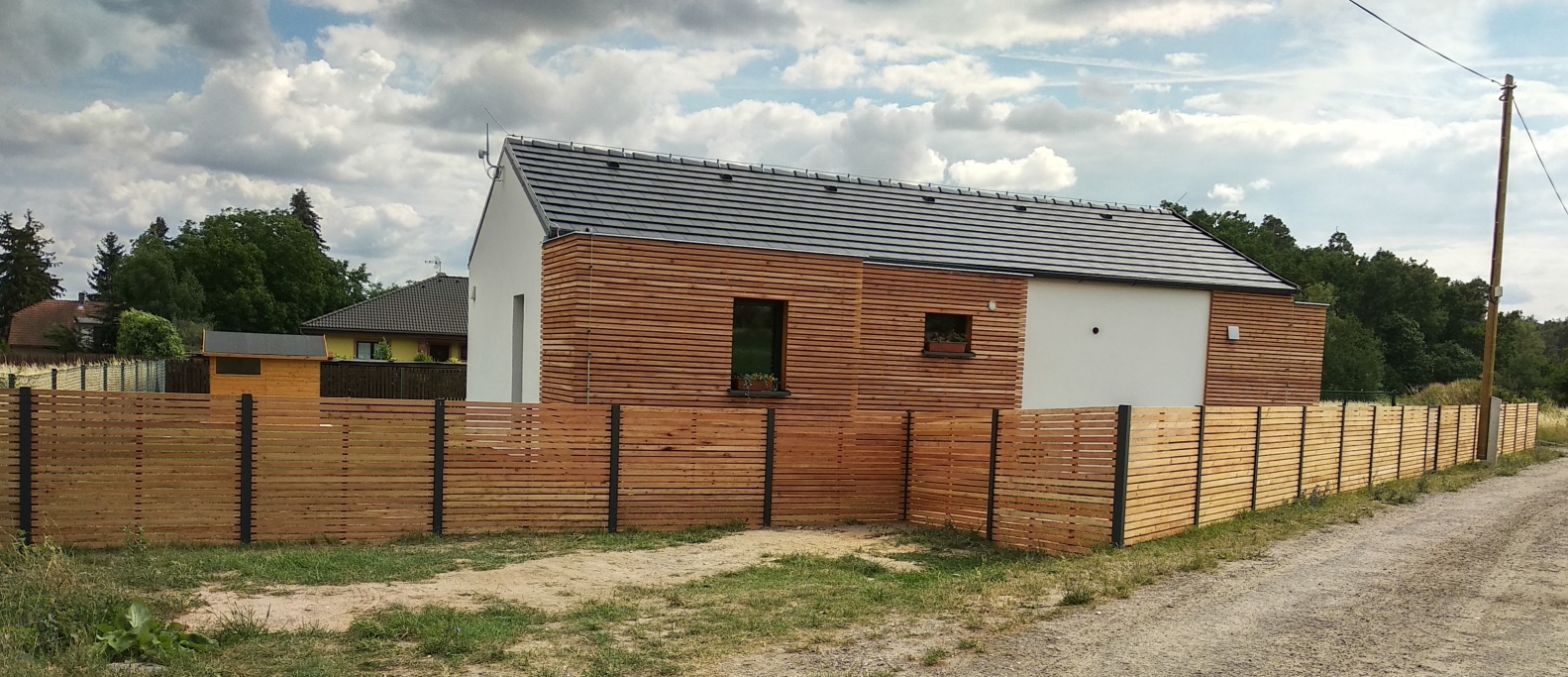 Kompletní realizace exteriéru rodinného domu — betonáž sloupků, výroba plotu s dřevěnou výplní a provedení fasády.