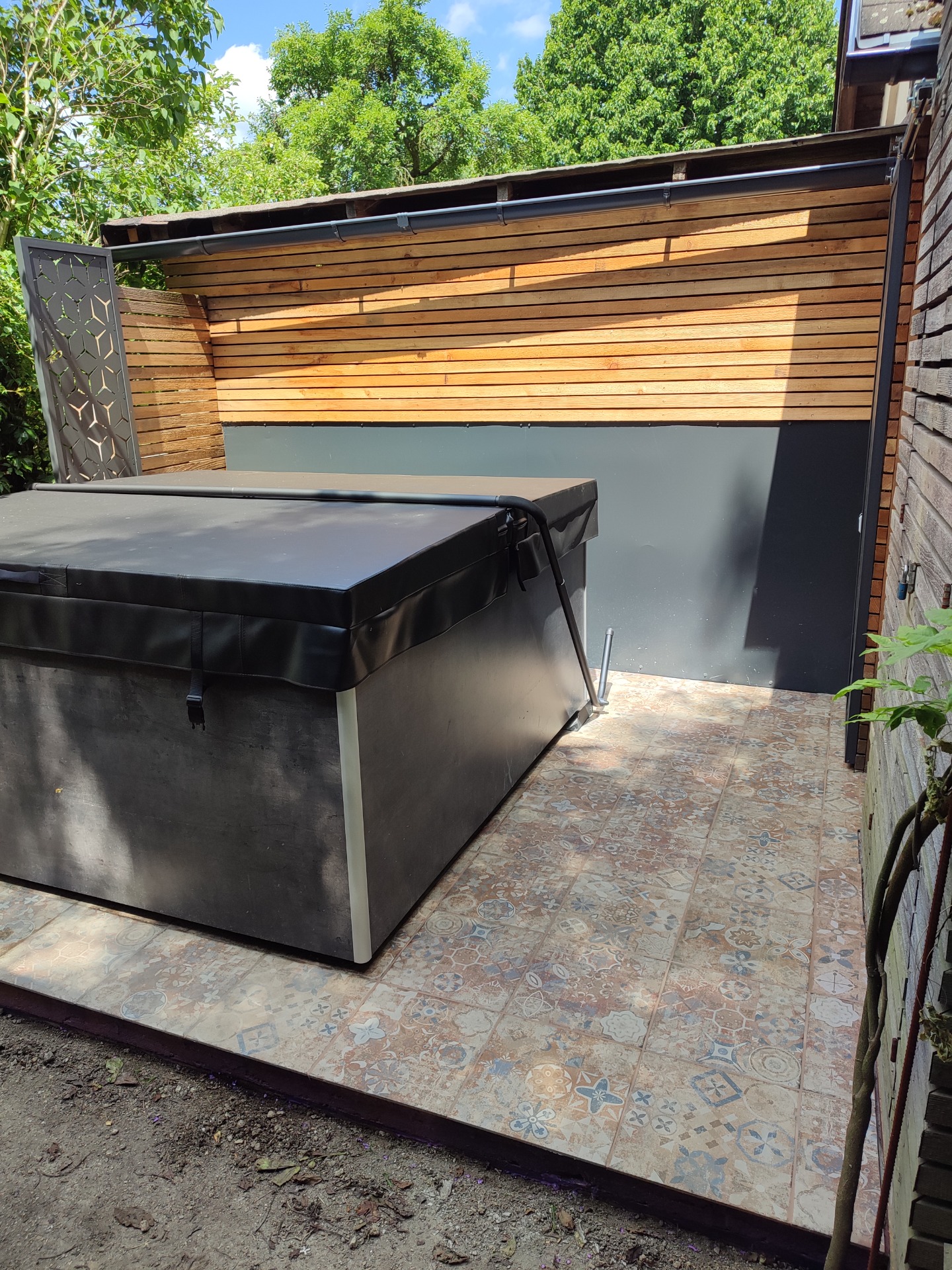 - Úprava stávajícího prostoru včetně obložení konstrukce, montáže dřevěné zástěny a pokládky venkovní dlažby pro vytvoření funkčního zázemí pro vířivku.