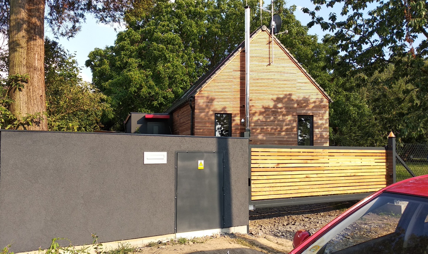Kompletní realizace vstupní části rodinného domu — fasáda, zídka, zakázková posuvná brána s dřevěnou výplní a ocelová stříška nad vstupem.